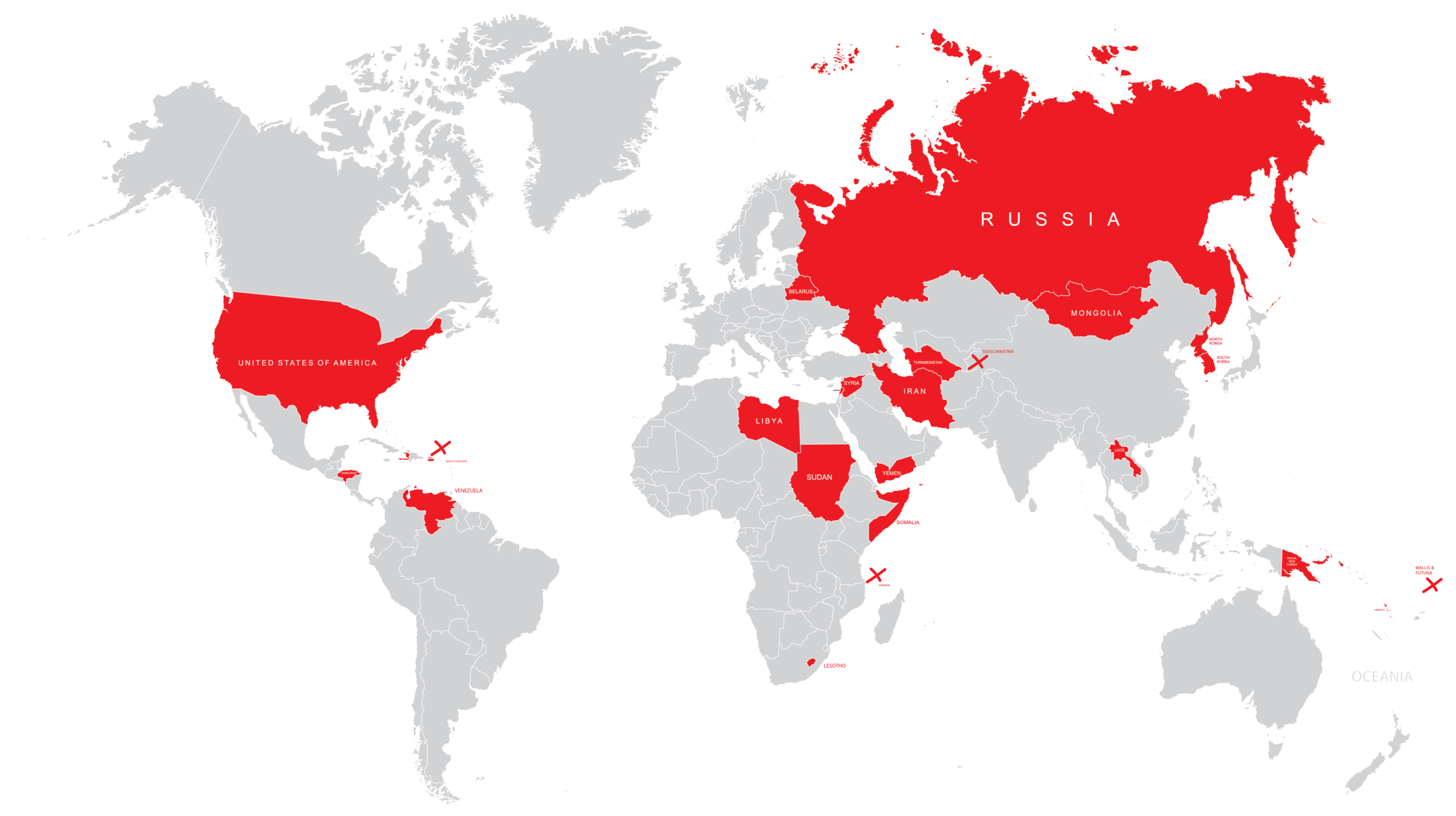 Länder mit Embargo oder ohne aktiven Postdienst: